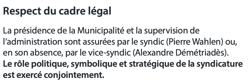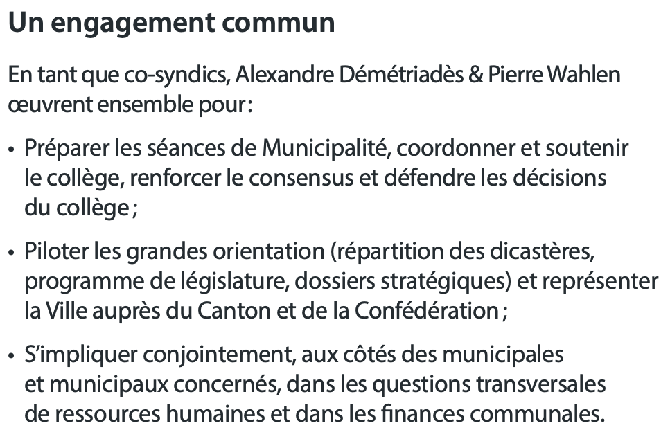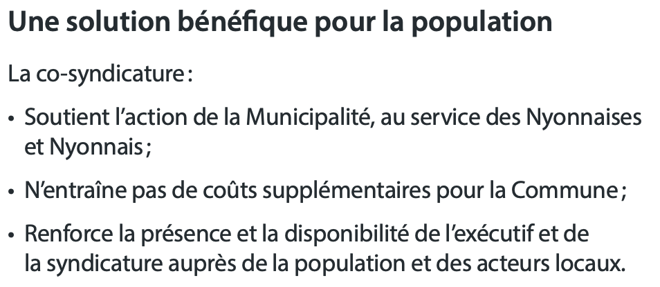 Nous souhaitons être fidèles à ce mandat en proposant une première évolution concrète : une co-syndicature pour Nyon. Dans ce modèle, les attributions institutionnelles légales sont pleinement respectées, tandis que le rôle politique et symbolique de la syndicature est exercé conjointement par deux profils expérimentés et complémentaires.